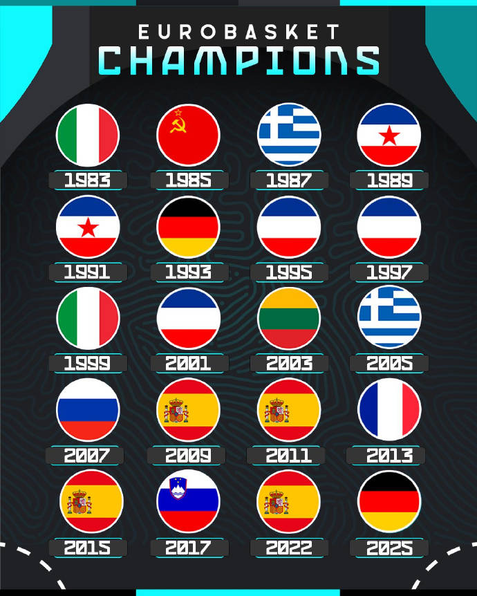 北京时间2025年9月16日,男篮欧洲杯正式落下帷幕,德国击败土耳其夺冠。这也是德国时隔32年后再夺欧洲冠军。历届欧洲冠军如下:1983年:意大利1985年:苏联1987年:希腊1989年:南斯拉夫1...