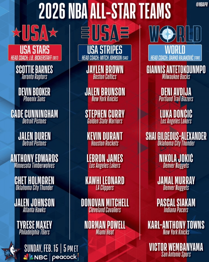 北京时间2月4日,2026年NBA全明星赛阵容分队正式揭晓,美国明星队、美国条纹队与世界队将展开循环赛制的小型锦标赛,进行四场12分钟的比赛。詹姆斯、杜兰特、库里汇集在美国条纹...