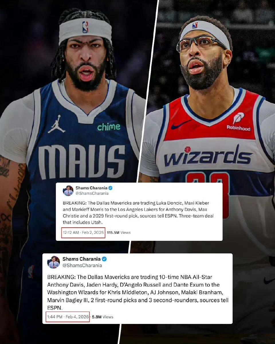 今日,NBA达成多笔重磅交易!其中独行侠与奇才完成交易!奇才得到安东尼·戴维斯、丹吉洛·拉塞尔、杰登·哈迪、丹特·艾克萨姆独行侠得到克里斯·米德尔顿、AJ约翰逊、马尔文·...